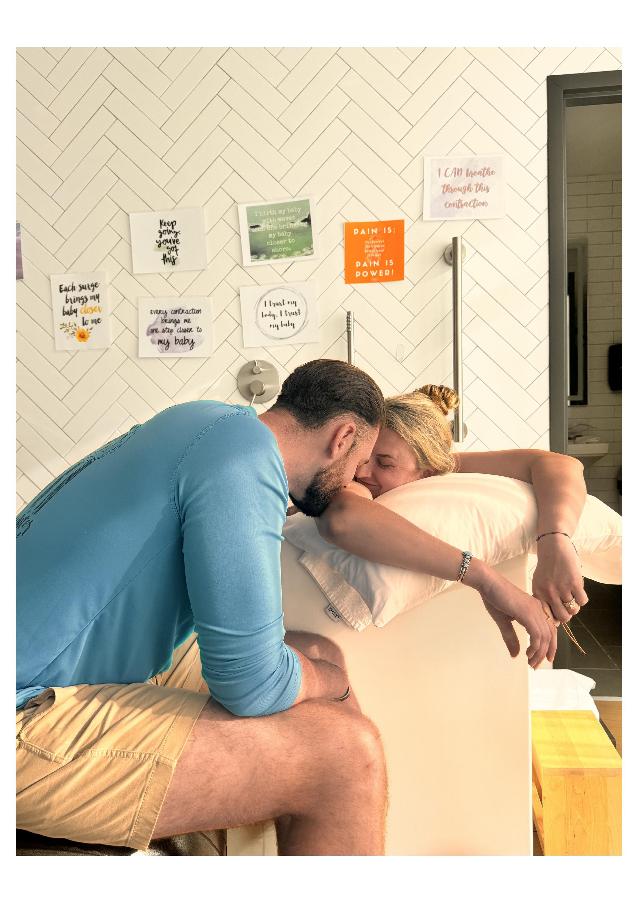 When I arrived, the room was dim and peaceful. Jordan and Matt were resting together, conserving energy between surges — one of the most important and often overlooked aspects of early labor.